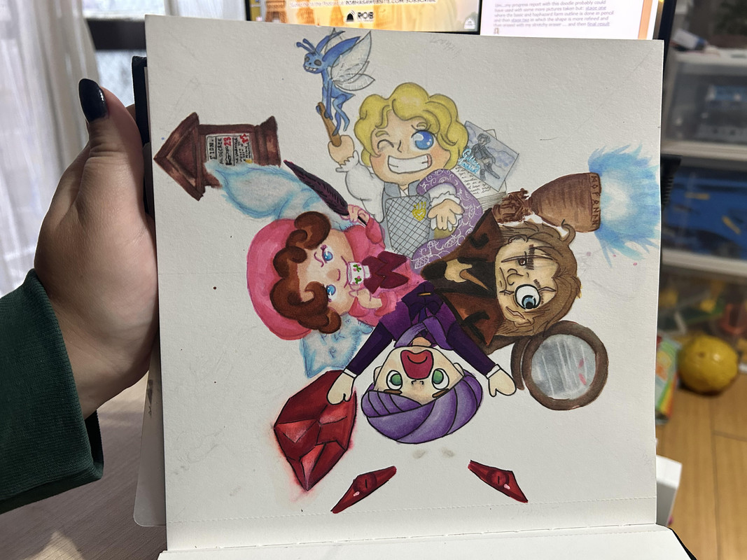 Author was pretty self explanatory considering the man himself, so I drew a stack of some of his published works and made a valiant attempt at putting the titles on them in tiny tiny tiiiiiiiiiiiiny handwriting. The books on their own were not really doing it for me, so I added some tiny candles and used the colorless blender on two of my yellow markers to create a glow effect on the flames
