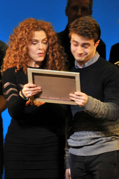 Daniel Radcliffe and fellow stage and screen actors Hugh Jackman and Bernadette Peters hosted the 2011 Gypsy of the Year competition this past Monday and Tuesday, where the Broadway shows that bring in the most money to benefit Broadway Cares/Equity Fights Aids are called out for their contribution. As no surprise, How to Succeed in Business Without Really Trying took the top musical fundraising prize, bringing in $325,935; overall the productions took in $4,895,253. Photos of Jackson and Peters handing Dan the award on Tuesday at the New Amsterdam Theatre in New York City can be found in our galleries.