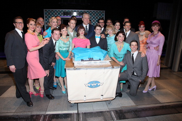 This past Saturday marked the 250th show for How to Succeed, and Dan along with his costars, including John Larroquette, Rose Hemingway, and more, posed before a massive blue-tie cake commemorating the milestone. Photos of the cast from the Al Hirschfeld Theatre can be found in our galleries.