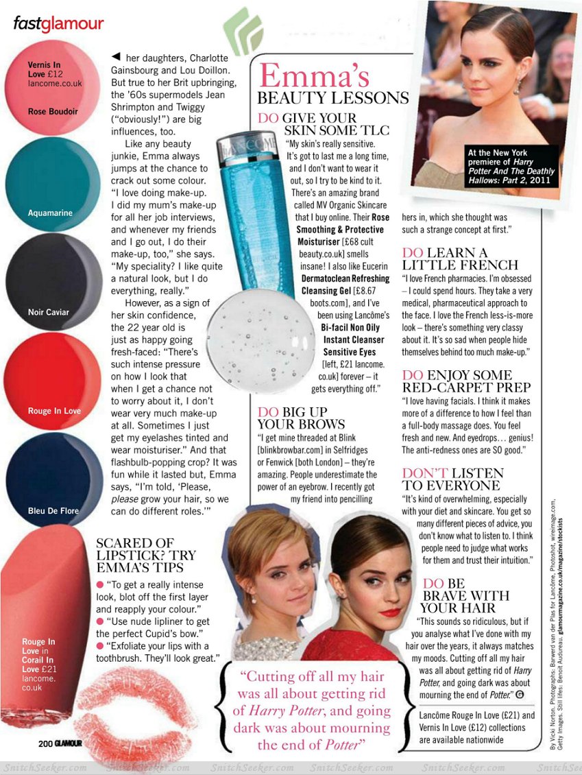 Emma Watson gave a few fashion tips and commented on how her famous haircut was a direct effect of the end of the Harry Potter film series in 2010 in the June issue of UK's Glamour magazine, as part of promotion of her Lancôme beauty lines. The Hermione Granger actress, who recently completed work in her next film project, Sofia Coppola's The Bling Ring, mentioned a few of her red carpet and everyday makeup regimes. That full article can be read in the scans below.