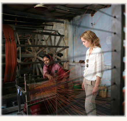People Tree have sent SnitchSeeker the first photos and a look at the making of Emma Watson's autumn/winter 2010 People Tree fair trade fashion line. The first half of the video followed Emma and People Tree founder and director Safia Minney through the rural towns of Dhaka and Bajshahi in Bagladesh this past July. They visited Swallows, the Fair Trade project that make Emma's clothing line in Bajshahi. Swallows dyes natural yarn, hand weaves fabric and hand embroideres clothing, providing work for over 200 women.