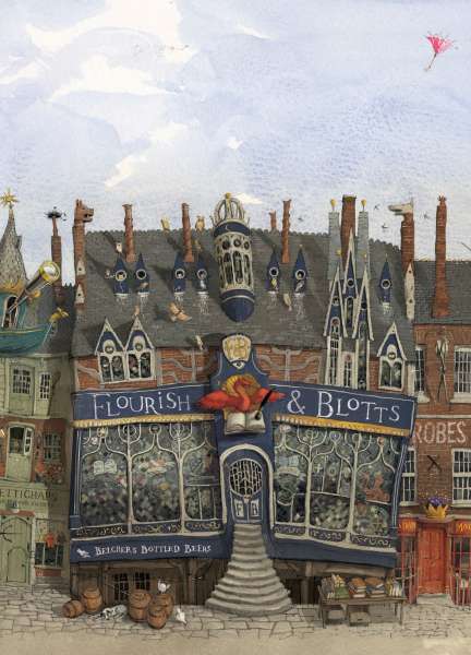 Bloomsbury release a brand new piece of artwork from Harry Potter and the Philosopher’s Stone: Illustrated Edition. Illustrated by Jim Kay, Kate Greenaway Medal winner, the image shows the front of Flourish & Blotts the bookshop on Diagon Alley where Harry buys his first set of school books.