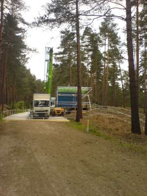 New photos from the Swinley Forest Deathly Hallows set were taken earlier today, which show a green-screen erected crane and truck sitting near the woods, as well as a large wooden barrier before a walk-path and camouflage netting on the grass. They can all be seen below: