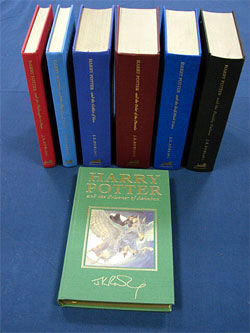A complete set of signed Harry Potter first edition books will be auctioned at UK Auction on July 1st 2008. The lot, which can be seen below, is estimated to go for £15,000 – £20,000. All of them are deluxe hardback editions in near fine condition. The signatures are not dedicated.  |