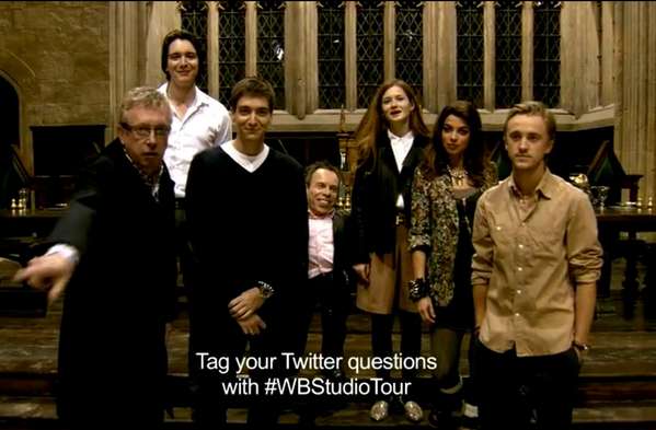 Warner Bros Studio Tour London: The Making of Harry Potter , open to the public beginning March 31, 2012, released a tiny preview of the cast that will be participating in Thursday's fansite and Twitter chat, including - from left to right - Mark Williams, James Phelps, Oliver Phelps, Warwick Davis, Bonnie Wright, Natalia Tena, and Tom Felton. Do note that although Julie Walters was listed in the original cast to take part, she does not appear in the preview below.