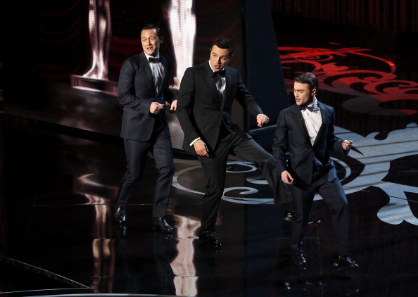 First, the camera was only showing Joseph Gordon-Levitt & Seth McFarlene. Daniel was dancing too far to the right.. Secondly, Kristen looked like she could barely walk in the shoes let alone across the stage.