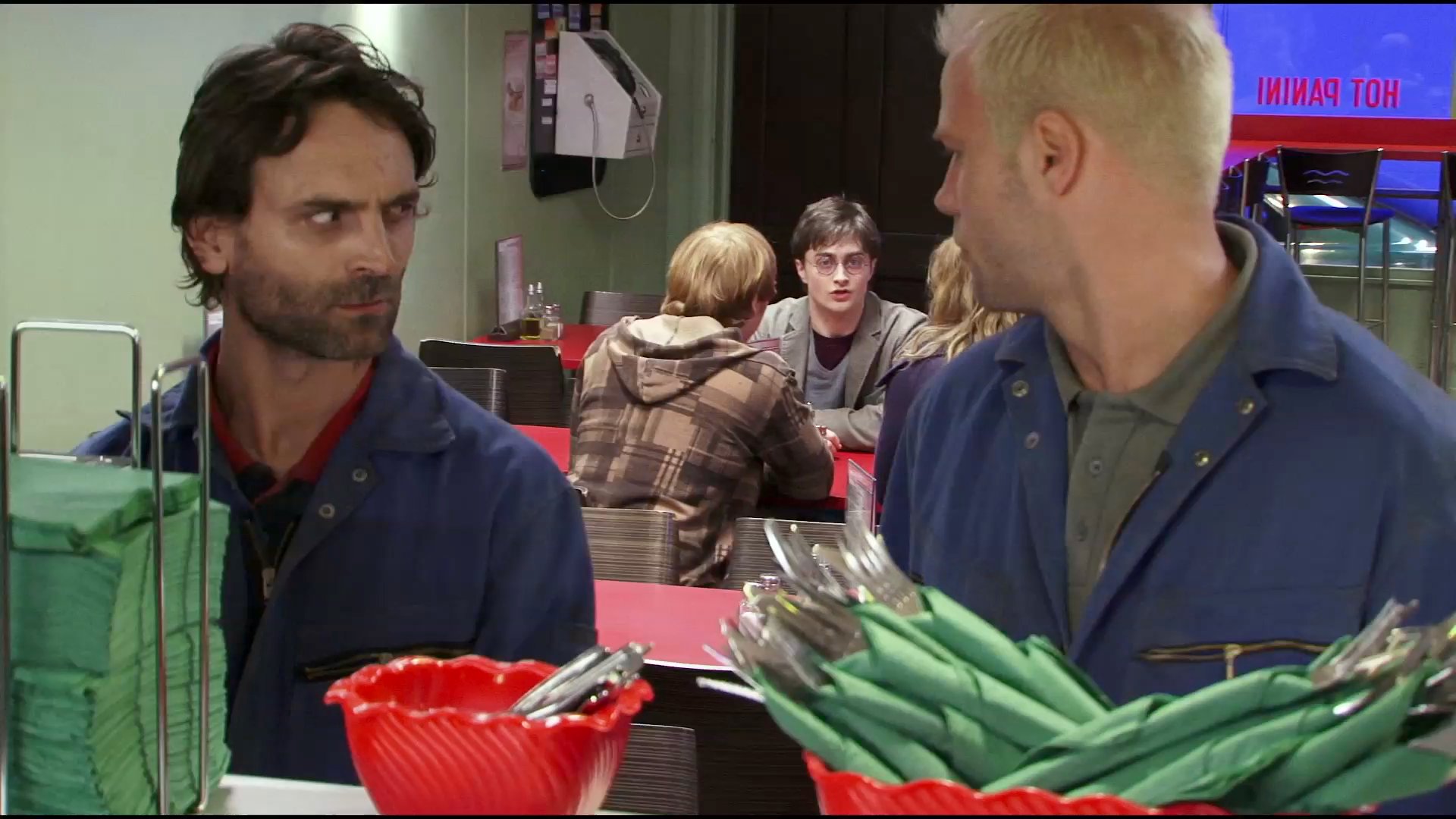 Isn't Harry supposed to be under his Cloak when they're in the cafe and get attacked by the Death Eaters? I wonder why they left that out.