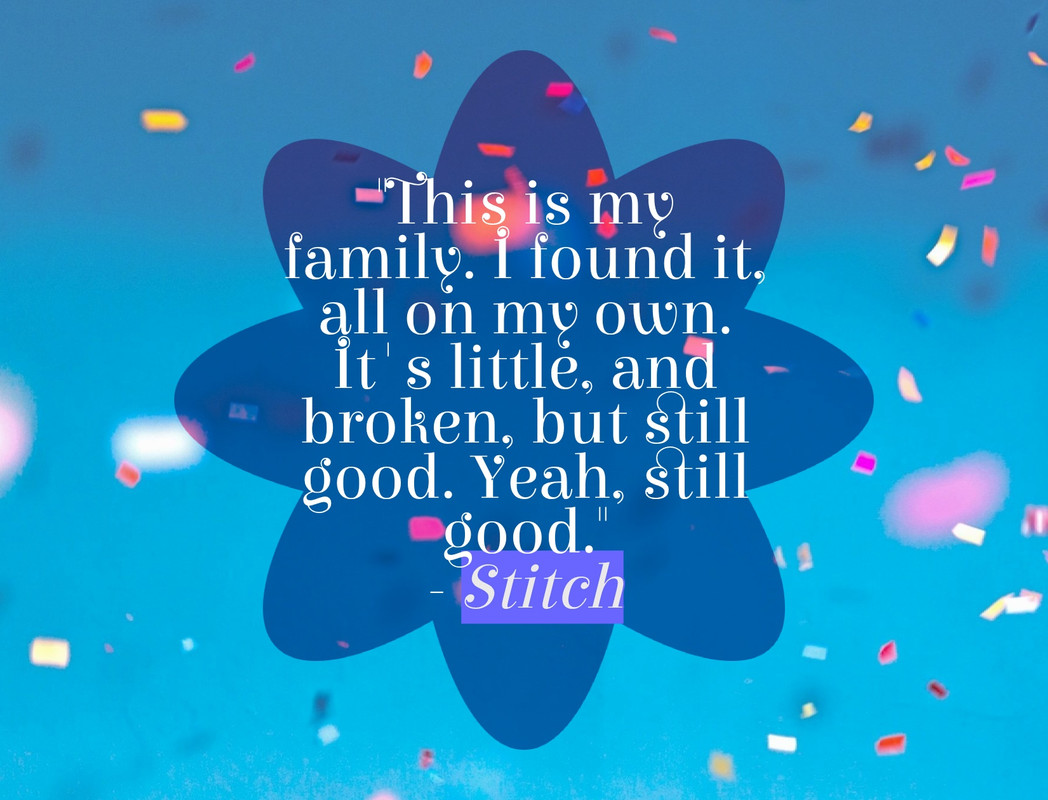 Here's my all time favourite Stitch quote, which really does apply to many of our lives In my mind, the confetti represents the fun and laughter he brought Lilo; the flower outline could be a flower used to make leis {which further signifies the setting of Hawaii} and the blue naturally represents Stitch.