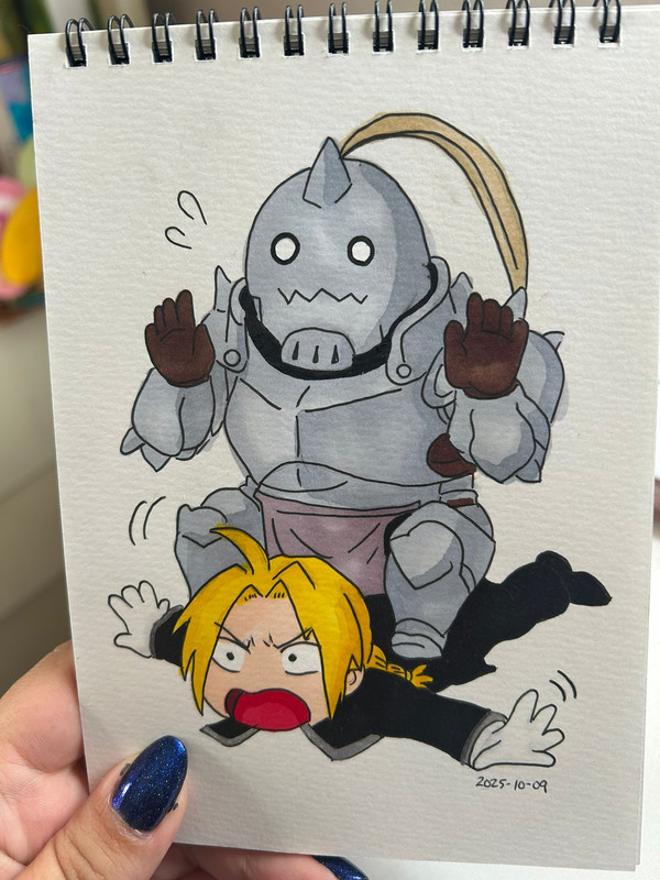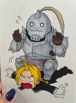Copic Multi Liner When it really comes down to it, Fullmetal Alchemist is the story of two brothers bound by loyalty and a shared promise to reclaim their original bodies, no matter the cost. Amidst the series’ darker turns, moments of comic relief are a breath of fresh air. Armstrong, as previously mentioned, serves as one source of this lightness...but so does the brothers and their devotion for one another. I wanted to capture that unshakable closeness between Edward and Alphonse here, in which they are quite literally stuck together with Alphonse accidentally squishing Edward under the weight of his heavy (but hollow) armor. Despite the chaos, the Elric brothers are always in each other’s corner. Their loyalty isn’t just solemn or serious—it’s lived-in, affectionate, and full of humor, the kind that endures through every trial and tumble.
