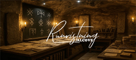 The Runristing Alcove sandwiched between the Ancient Runes classroom and Professor Cox's office is less a hallway and more a half hidden workshop. Marked by stone arches covered with faint carvings of Elder Futhark and other ancient scripts, lanterns burn low here with their light casting long shadows across tables piled with rune etched fragments, parchment scraps, and magnifying lenses. The tables are known as the Translation Tables and are where students may painstakingly practice piecing together lost words and fractured inscriptions. Opposite the Translation Tables stands the Archive Cupboard. Inside its heavy oak doors are rare scrolls, manuscripts, and dictionaries too fragile or, in some cases, too dangerous for casual hands and require explicit permission from Professor Cox before use. The air carries the scent of stone dust and scorched wood from the Carving Nook just adjacent to the Translation Tables, where chisels and enchanted knives are set out beside small slabs of practice stone. Along the far wall, a tall glass fronted case hums quietly and homes rune stones of various origins for student use. And at the heart of the alcove stands the Bind Rune Practice Wall. This broad slate is enchanted to project the runes drawn upon it so that students may freely practice their craft without fear of implosing or magical rebound. When combinations succeed, they glow with a brilliant blue. When they fail (as they all too often do) they shimmer, flare, or collapse in soft showers of red sparks.