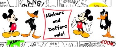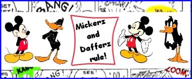 Um... lemme think... Huh... :hack: Huh... Can you make me a siggy with Daffy Duck and Mickey Mouse? Um... cartoon or old school black and white is fine. Uh... with the text "Mickerz and Dafferz rule!" So... somewhere along the lines of that! |