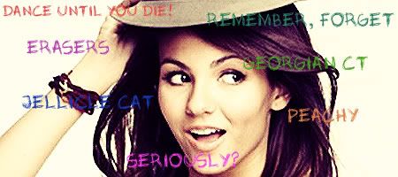 Text? For the first one: "Dance until you Die!" "Remember, Forget" " Erasers" "Georgian Ct" "Jellicle Cat" "Peachy"and "Seriously?" can be randomly placed arround the siggy in a smaller size. The font can be edgy but fun, each quote can be a different colour!!