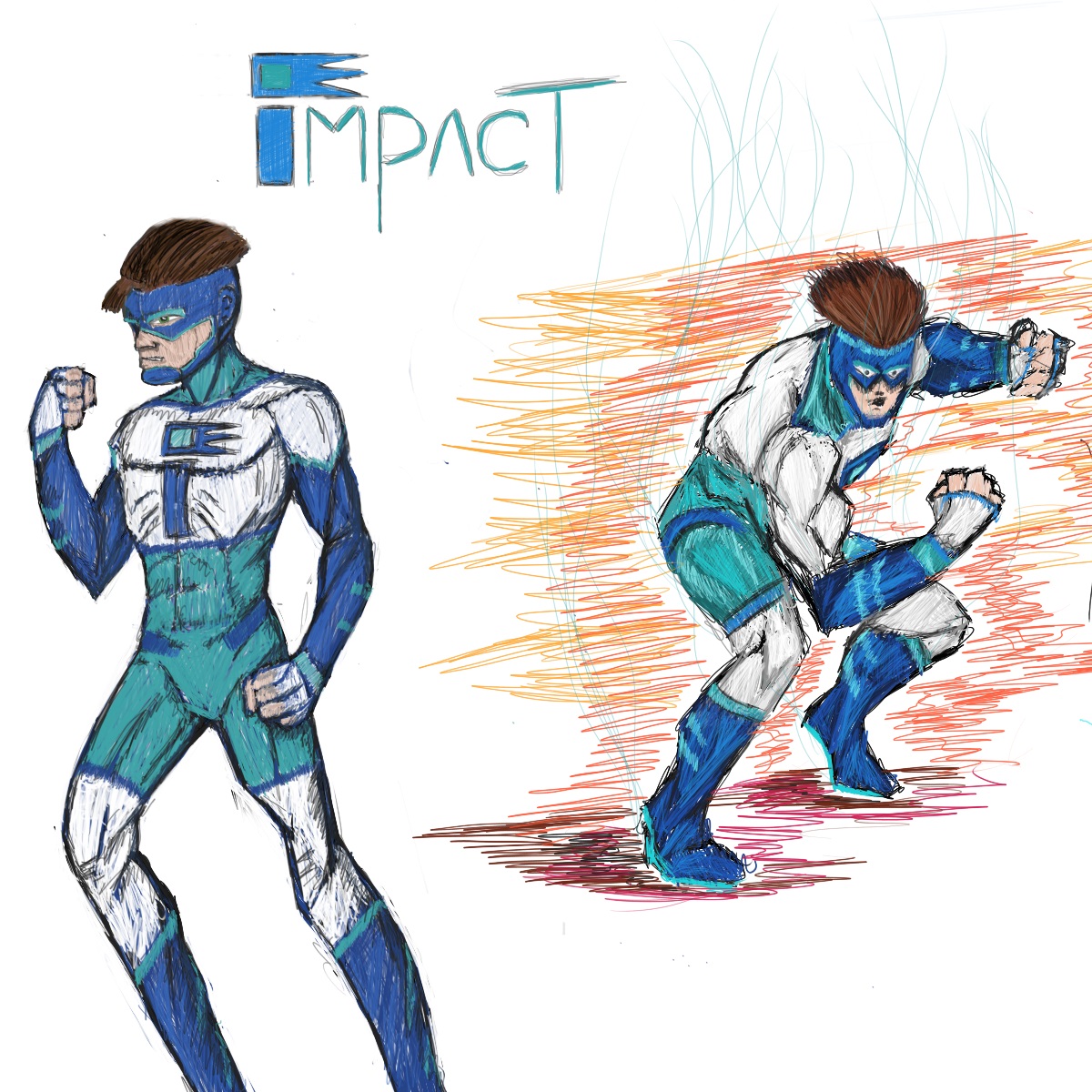 And here we go. The piece I've been messing around with the past 2 days. Another Super Hero. This time reimagined through the digital medium. Photos!: Crash!Impact "The Burst Hero" I began to question the blue and teal so I went with the reliable Red, White, and Blue color combo. Switched the teal for gray and added lines and details with red and blue to let the costume stand out a bit more. pulled the blue sleeves up to his shoulder in the action shot. I also added the burning sparks look to show off what his power might look like as he stores and releases the kinetic energy. Photos!: recolored Crash!Impact. w/ added power effects |