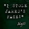 Just text, but could the backround be a darkish green with the words: "I STOLE JARED'S FACE!" Alyss on it.