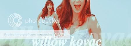 -Steals the last spot- :evil: -I'd like to have a signature and avatar, please. -Pictures: Use any of these. -Text for siggy: Willow Kovac -Text for avvie: Noneeeee. =D -Size: I don't care much for the width, but could the siggy be no taller than 160, please? ^^ -Any other specifications? I pretty much LOVE selective colouring, so feel free to play around with it a lot. Oh, and Willow's eyes are supposed to be green, as opossed to the model's pretty blue eyes. XD THAAAAAANKS. :glomp: |