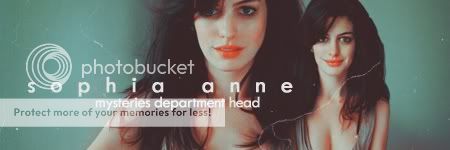 *sneaks in* First of all, just wanna say that this shop is FTW!!! :pfd: Onto other business though.... :whistle: I'm in need of some very colorful, yet sophisticated Signature/Avatar set. Something to draw people's eye in... ya know the kind, eh? ;) Picture(s): Preferably from her photoshoot in 2006, but if you see a photo you like better from another of her photoshoots then feel free to use that instead. Avatar text: none Signature text: Sophia Anne Vivaldi (or just 'Sophia Anne'... whichever ;))... and 'Mysteries Department Head' Size: Width isn't a concern; use your good taste. But height would be preferably no larger than 150 pixels. Other specifications? Nope. I trust both of your graphic abilities ;) <33 Thanksss in advanced! :glomp: |
