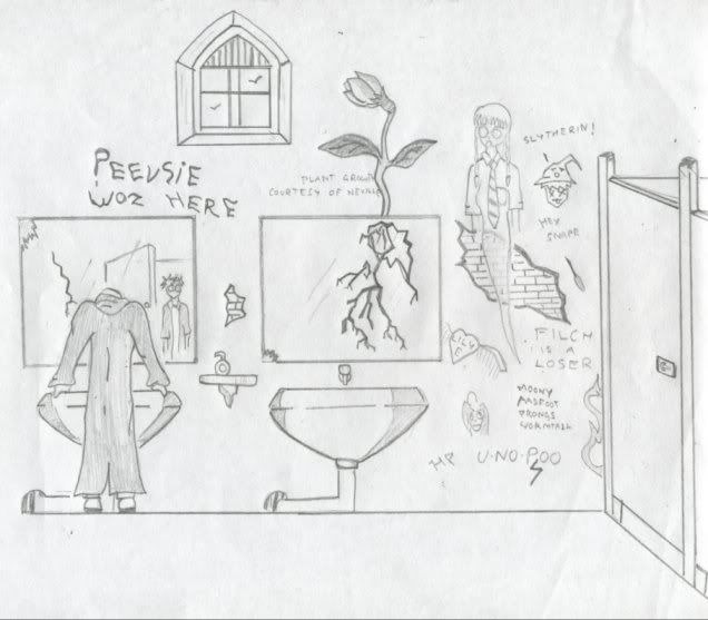 okie now, Harry is the guy in the reflection. Moaning Myrtle is seen floating on the right-hand side and there's a plant growing out the mirror. I drew that as a tribute to Neville's skill in Herbology. And Draco is seen with is head down and there are few words and doodles drawn here and there. I really like this pict!!!!