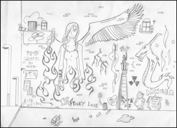 Anyways, the drawing below is "supposedly" a wall painted by artists all over. In short its a graffiti art wall. I got inspired in one show where in Argentina they have lanes like these where people paint all over, and it looked amazing. So, here it is. - Graffiti Wall - Stinky Lane