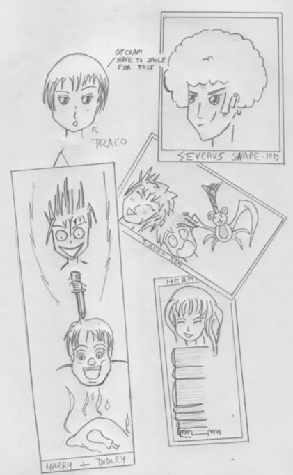 yea, like I said. This one is not too good...but it was just a try out and it was late at night so I have my excuse for it's crappiness. :p btw, the guy with the afro is Snape in the 70s, the next is Fred and Ron, that was when the twins turned Ron's tedy bear into a spider. then we have Hermione and Harry with Dudley.