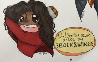 inspiration SSRPG character Becky Rasting (sweetpinkpixie) & featuring Sam Gusey (Cassirin) materials Ohuhu brush tip markers, copic fine inking pens 0.3 & 0.1, Gelly R@ll White 1.0 & 0.8