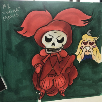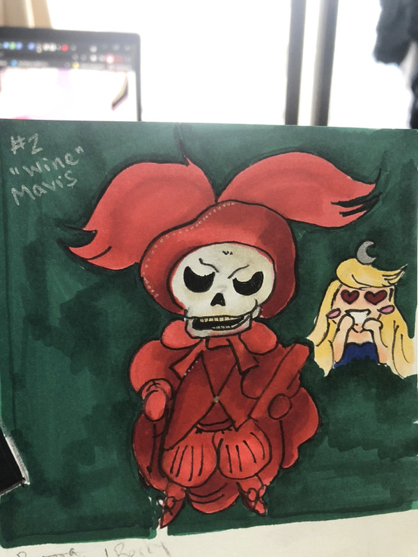 This concept maybe came with a two second delay compared to the previous one, but it was still a pretty instantaneous visual. Once upon a time when I was in Jr high or elementary school or something...I read a Rayearth fanfic where a character's voice was described as being 'rich like wine' and that comparison really struck me and I've kept it with me ever since. So seeing 'wine' as a prompt immediately made me think about rich voices and with Mavis being a musical devotee...it was easy for the rest to fall into place. Wine also elicited a visual of a deep red color and no other musical moment quite captures that 'I AM HERE' while sporting some rich red coloring like the Erik appearing as the Red Death during the Masquerade Ball in the Phantom of the Opera musical.