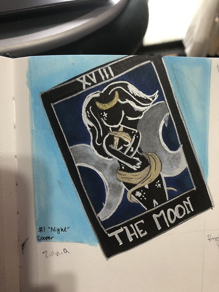 So, on this 'The Moon' card, you see an interpretation of the goddess Selene with two crescent moons in different phases on either side. My POSCA pen kind of exploded and ruined the hand (which I am already terrible at drawing) so that's an area that makes me cringe. I added white POSCA down first and then added silver and gold on top of that.