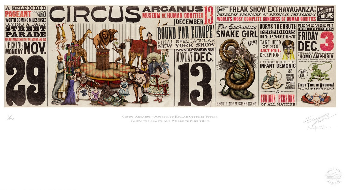 Circus Arcanus - Museum of Human Oddities. The poster shows that this circus was in New York City (where Newt starts off in the sequel), and as with many circus acts in the early 1900s, features an array of animals and human actors.