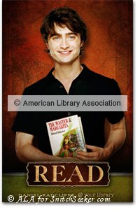 New preview photos of Daniel Radcliffe, Rupert Grint, and Emma Watson urging youngsters to read as part of the American Library Association's READ campaign have been released on the ALA's website (where the posters can be purchased). Those new photos can be seen in our galleries. UPDATE: The ALA have sent over slightly larger images of the trio's READ campaign photos. Those are below.