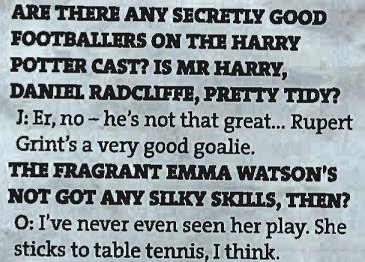 In the January 2010 issue of Front Magazine (scans courtesy of Phelpsaholics) actors James and Oliver Phelps delved into their love of football, and briefly mentioned how good - or not - their Harry Potter costars are athletically.
