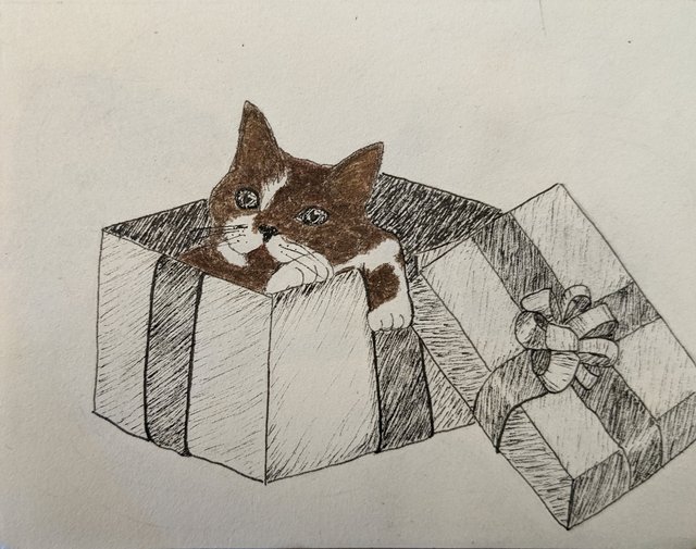 On Henry Whittebrook's 16th birthday, just as Charlotte Kettleburn gave him his birthday present, a chocolate brown and white kitten, a portal to another dimension opened up next to him and sucked him in, leaving a panicked girlfriend and confused kitten. I drew what remained after he vanished - a kitty in a wrapped box, with the lid askew.