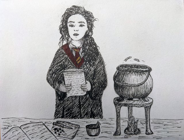 This drawing depicts my character Karleigh Creed working on a potion that she had paired up with Benjee Marchbanks as a long term project. Though they were, and still are, friends, she also had a pretty big crush on him. Once he had a girlfriend, she knew she had to get over this crush, which proved a little difficult while working closely together over a project that took months. It was a little distracting to work on an advanced potion and work through mostly unreciprocated feelings at the same time, but she eventually managed. And she is really trying to concentrate here.