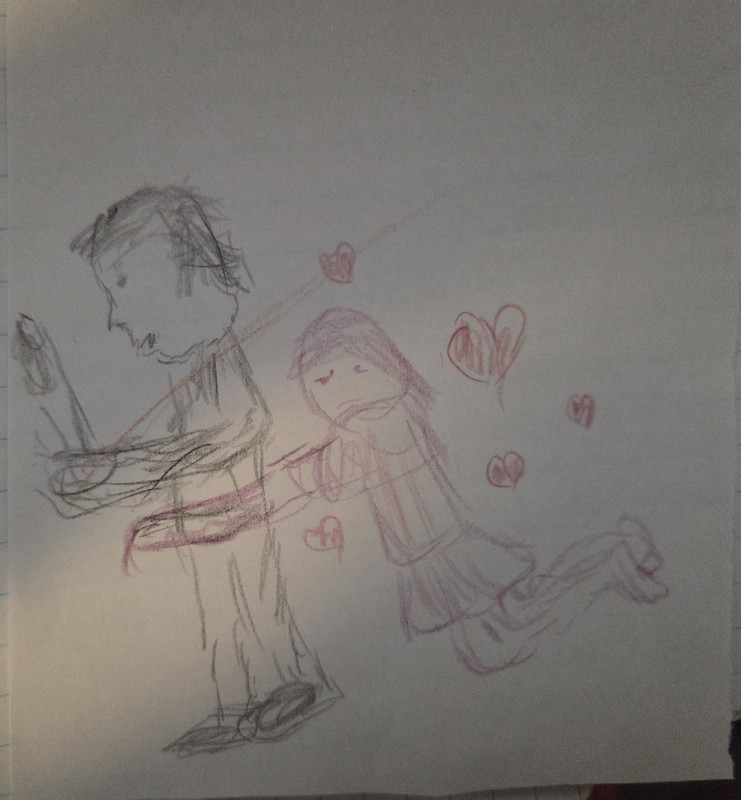 I totally messed up the guy's hands and there was no saving it without starting over completely. But I used separate colors for the people mostly to help identify that there's two people here, she's kind of lusting after him and he's all indifferent. I thought about just doing a broken heart too... but I was like, oh, i can maybe do a little more??