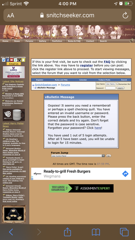 Hello! When trying to access my own profile (either directly from the URL or through clicking on site) I'm being redirected to the forum page (https://www.snitchseeker.com/forum.php).