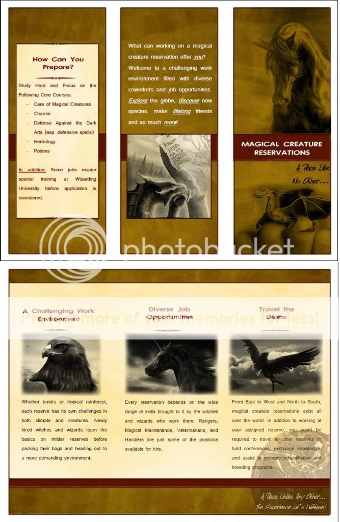 "Well," Ivan held out one of the pamphlets for her, "there's a pretty big variety of jobs on each reserve. I'm a vet, and my partner works as a ranger. It really depends on what your personal interests are; if you like Charms you could work on maintenance of reserve borders, if Herbology and Potions are more your thing you can focus on mixing medicines for the creatures... it all depends. And of course you have to like animals and get good grades in Care of Magical Creatures." He shrugged and smiled, "What courses do you like at Hogwarts?"