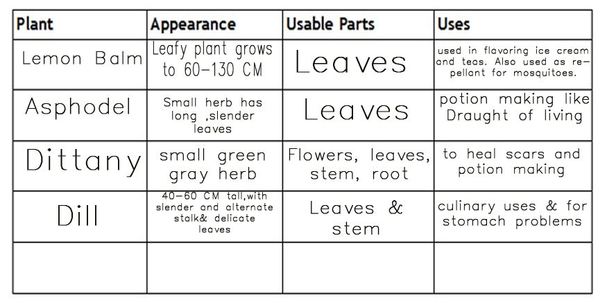 Taylor walked around until she saw Lemon balm. She shall make it her fifth and last herb. Tay settled her writing things and textbook down and shifted so that she could use her quill. Taylor started filling out the table and finishing it.