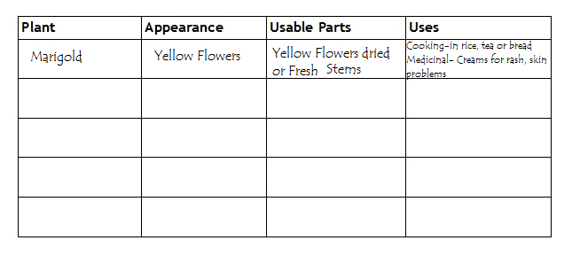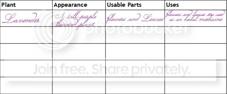 Nerida for the third time, began looking around for a herb. This time her eyes fell on a famillar plant that she had seen in her grandma's garden. What had she called it? It had those small flowers.. That was it! Lovage! Sitting down next to the plant. She observed and looked at it. Jotting down her observations as the time passed. Finishing up the third line of the table, before finishing Nerida began to look around for the herb she would use as her fourth herb. Her eyes caught Rosemary, basil and some other herbs. Looking back down at her table she finished up the usable parts section for Lovage.
