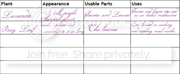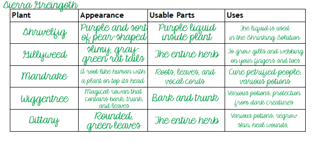 Sierra stepped off to the side and began her note-taking about the dittany plant. Hmm...how should she describe it? It had green leaves...and then the leaves were sort of rounded. She wrote that down, not really sure what else to say. Then she wrote about how the entire herb could be used for potions, regrowing skin, and healing wounds.