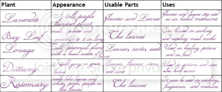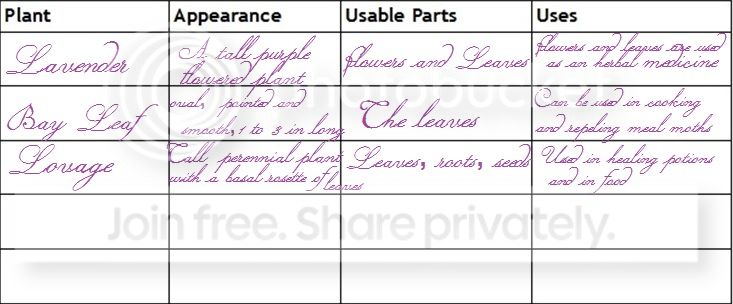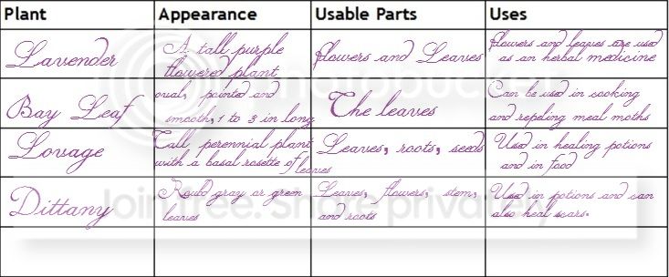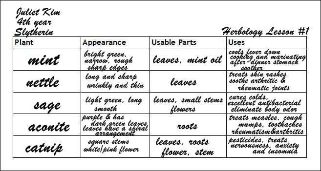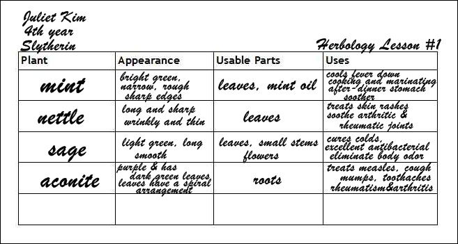 Hmmm...didn't sound too challenging. She had been around herbs all her life and could tell you anything and everything you wanted to know about them. So identifying four of them didn't seem to hard. Taking out a fresh piece of parchment Nell drew the table that had been given to them.