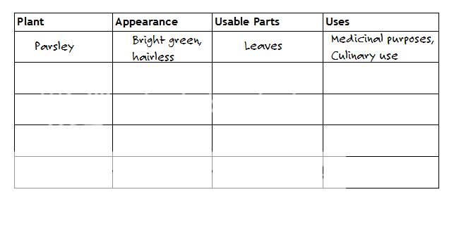 Alyssa decided that she would first go around and identify the herbs, research what their information and then when she was done she would insert the information into the table layout that the Professor wanted them to place the information in.