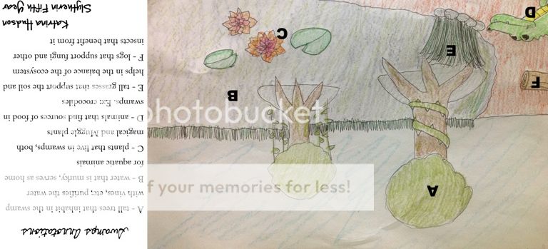 Once she was done, she looked at her drawing of the swamp. It was only that she was done drawing that she realized that she had forgotten to write the meaning of the annotations on her drawing, she flipped the page over and started writing the meaning to her innotations on the back of it. She hoped that the Professor didn't penalize her for making that mistake.