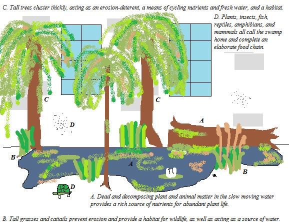 "Well like, swamps prevent erosion, don't they? Like all the trees and whatnot that grow in swamps along rivers and lakeshores, they keep the sediment from washing away on account of the water in swamps is slow-moving like Dylan said before, so it doesn't hit the shoreline and mess it all up."
