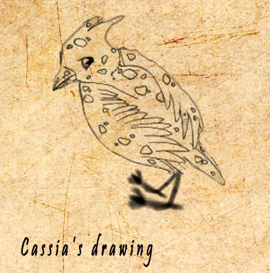 Taylor glanced up at the professor. Drawing? Yay! But... poor birdie... about to die... how sad... She frowned but went closer to the cage, admiring the bird and taking in all the details that she can. Tay turned and went back to her seat. Taylor got out some ink as well as parchment and started to slowly sketch the bird. Taylor started with the head... then the eyes... beak... then the outline of the body then the legs and out line of the tail. Tay then started to fill in drawing with the feathers and design of the bird. She went slowly and carefully, making sure that she got every single detail that she could remember. Taylor glanced at the drawing and grimaced. It wasn't her best drawing but it would have to do since she was rushed a bit. If she wasn't doing it for fun, she probably would take a week to admire the bird then a week to sketch the pretty thing but she was in class and a rough sketch would have to do.